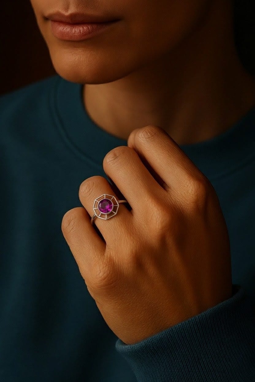 The stone is set in a decorative, sculpted band, where intricate metalwork embraces the gem with elegance and strength. The design balances refinement with boldness, making the ring as versatile as it is unforgettable. Whether paired with evening silk or everyday minimalism, it transforms the hand into a canvas of light and color.